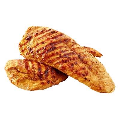 Grilled chicken breast with visible char marks and garnished with fresh herbs.